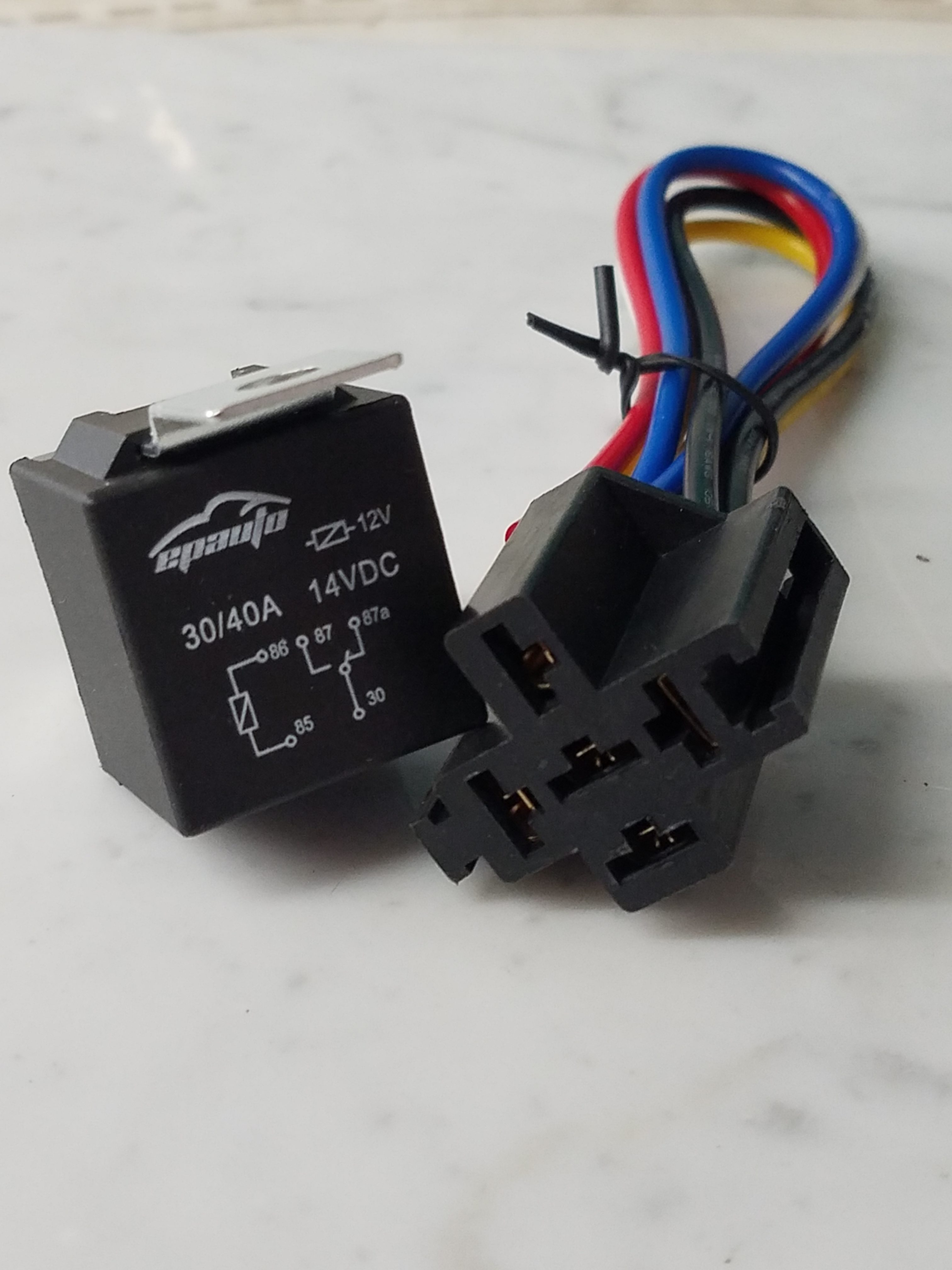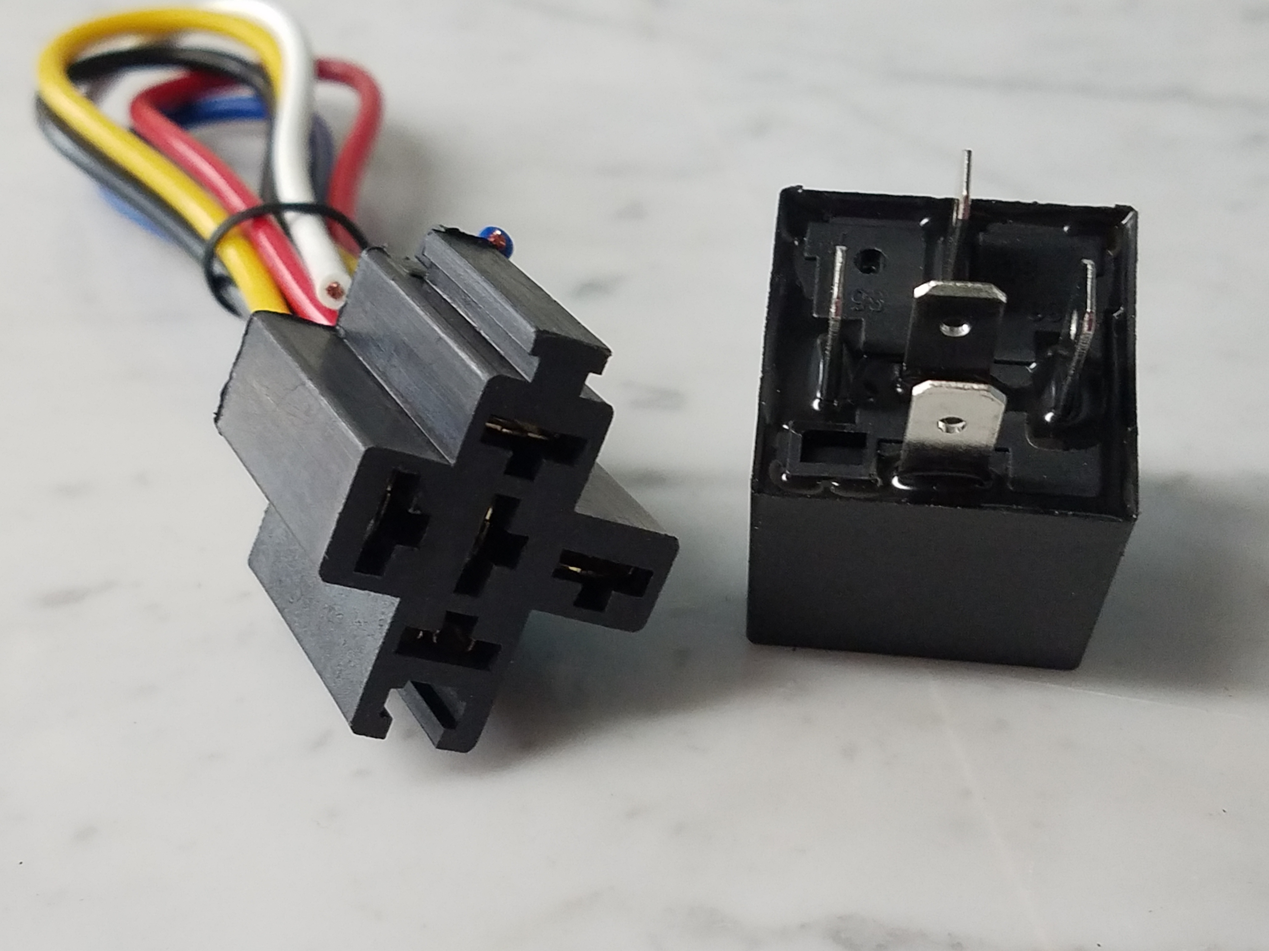 - Heavy-duty impact molded relay socket with 5 WIRES。White (common), Black (normally closed), and Yellow (normally open).